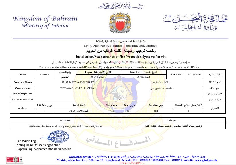 All projects are executed in full compliance with applicable local and international standards, maintaining the highest levels of workmanship. Our official accreditation from the Bahrain Civil Defence reflects our commitment to continuous improvement, allowing us to refine our installation techniques and align them with the latest industry standards and best practices. This ensures that our clients receive installations that are both technically sound and built to meet the demands of modern safety and security systems.